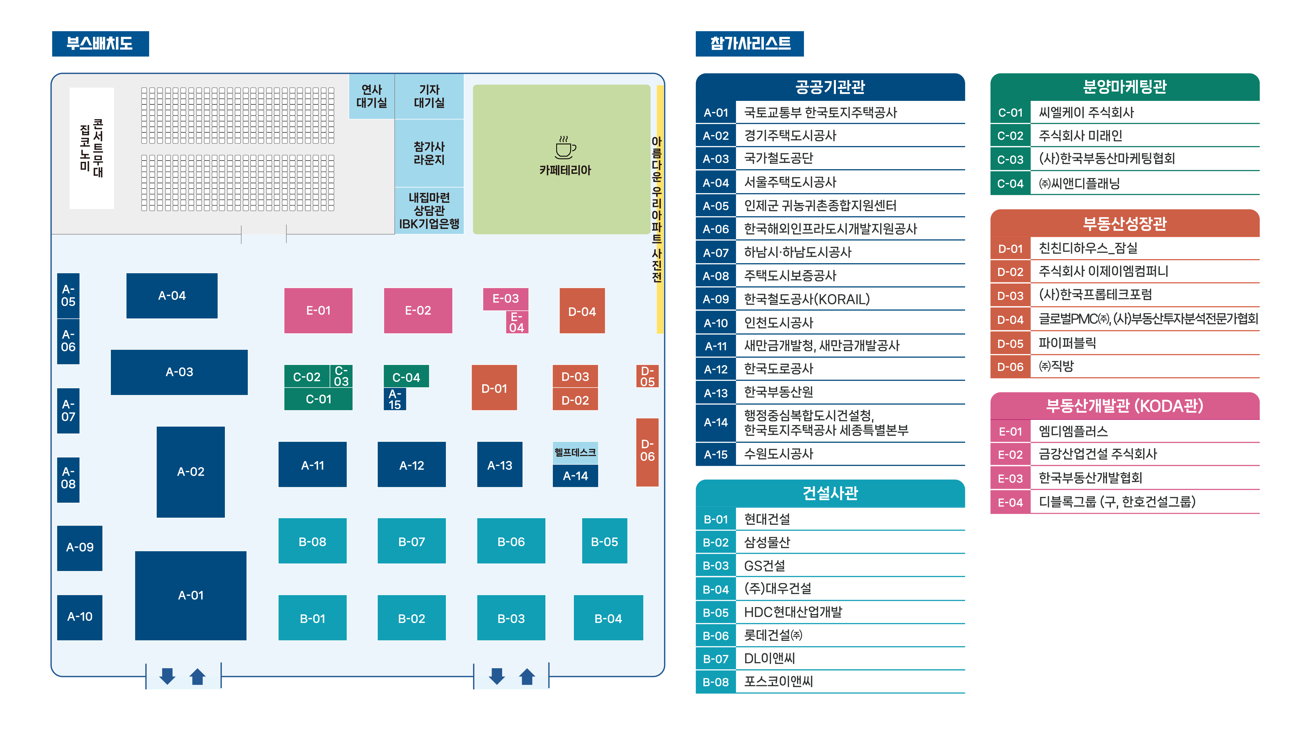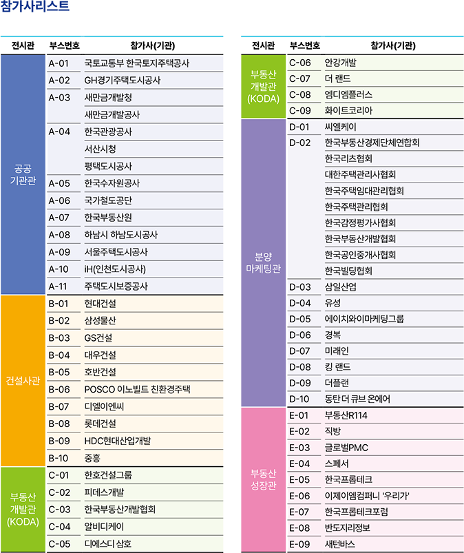 국토교통부, 새만금개발청, 한국토지주택공사, 인천도시공사, 서울주택도시공사, 새만금개발공사, 한국수자원공사, 한국관광공사, 주택도시보증공사, 국가철도공단, 한국부동산원, 대한건설협회, 한국주택협회, 한국부동산개발협회, 한국프롭테크포럼, 한국부동산분양서비스협회, 현대건설, 삼성물산, 지에스건설, 디엘이앤씨, 포스코이앤씨, 대우건설, 한국토지신탁, 대한건축사협회